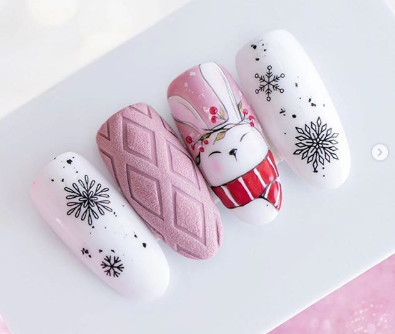 Девушки в поиске маникюра для Новогодней ночи делятся на два типа: 1 любят сдержанный маникюр и выделяют его только цветом ( красный, светлый, голубой и т.д.) или немного задействуют в оформлении блестки и камни; 2 тип ищут максимально насыщенные варианты ( снежинки, снеговики, еще и Деда Мороза нарисуют). Как же совместить оба варианта, при этом смотреться стильно не только в Новогоднюю ночь, но и смело демонстрировать свой маникюр на протяжении остальных праздничных дней, посещая работу и не травмировать окружающих гирляндами на ногтях? Ответ на этот вопрос можно встретить в следующих примерах красивого, стильного и, при этом, новогоднего маникюра. Нежный вариант сочетания двух цветов, отлично смотрится на длинных миндалевидных или квадратных ноготках. Рисунки выполнены очень аккуратно и красиво. Особое внимание стоит обратить на матовые вставки и объемные узоры. Маникюр с добавлением блесток и новогодних надписей. Снежное сочетание белого и серого цвета, маникюр смо
