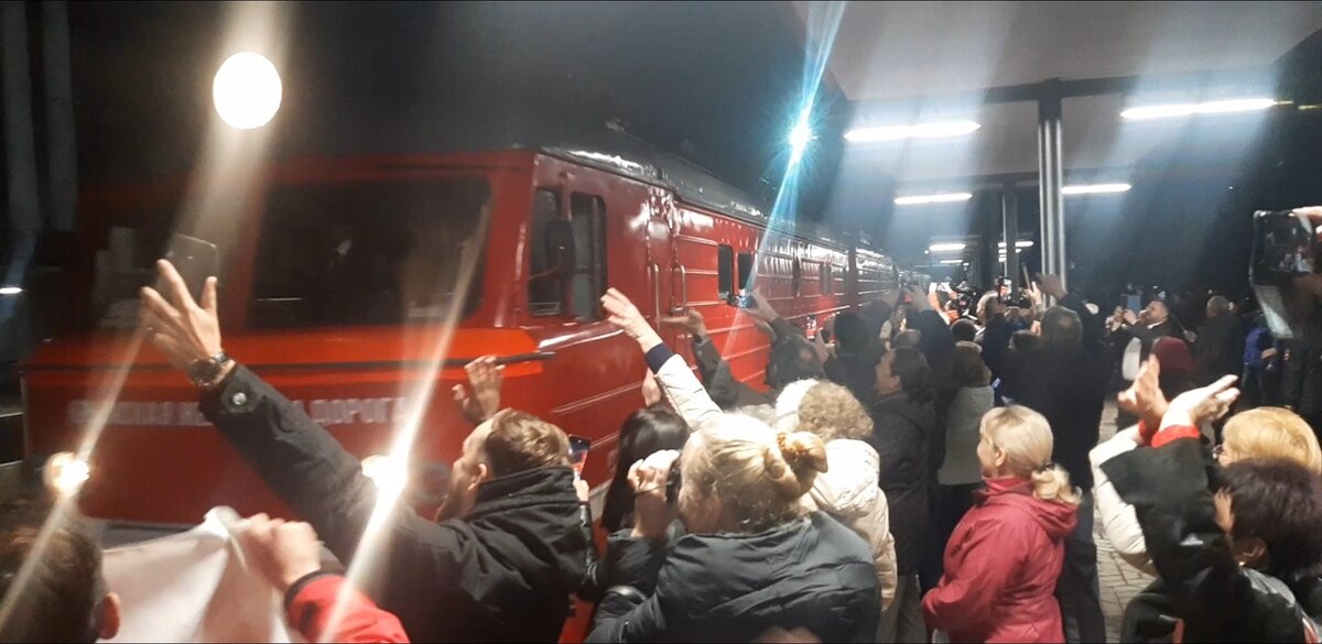 И вот вдалеке показался прожектор тепловоза, люди на перроне достали всевозможные гаджеты и начали снимать торжественное прибытие первого поезда. Как только поезд остановился у платформы включили музыку, гимн Симферополя. Обожаю эту песню. Пассажиры выходили