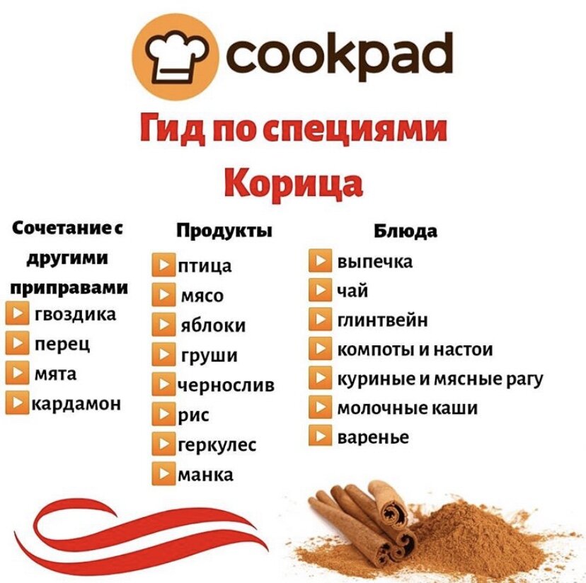 В продаже корицу-пряность можно встретитьс в виде свёрнутых в трубочку кусочков коры или в молотом виде. ⠀ Корица известна человечеству как минимум пять тысяч лет. ⠀ Кора корицы широко используется в качестве специи для десертов, шоколада, острых леденцов, ликеров, соусов. ⠀ #Cookpad #сайтCookpad #Cookpad_ru #вкусно #готовитьпросто