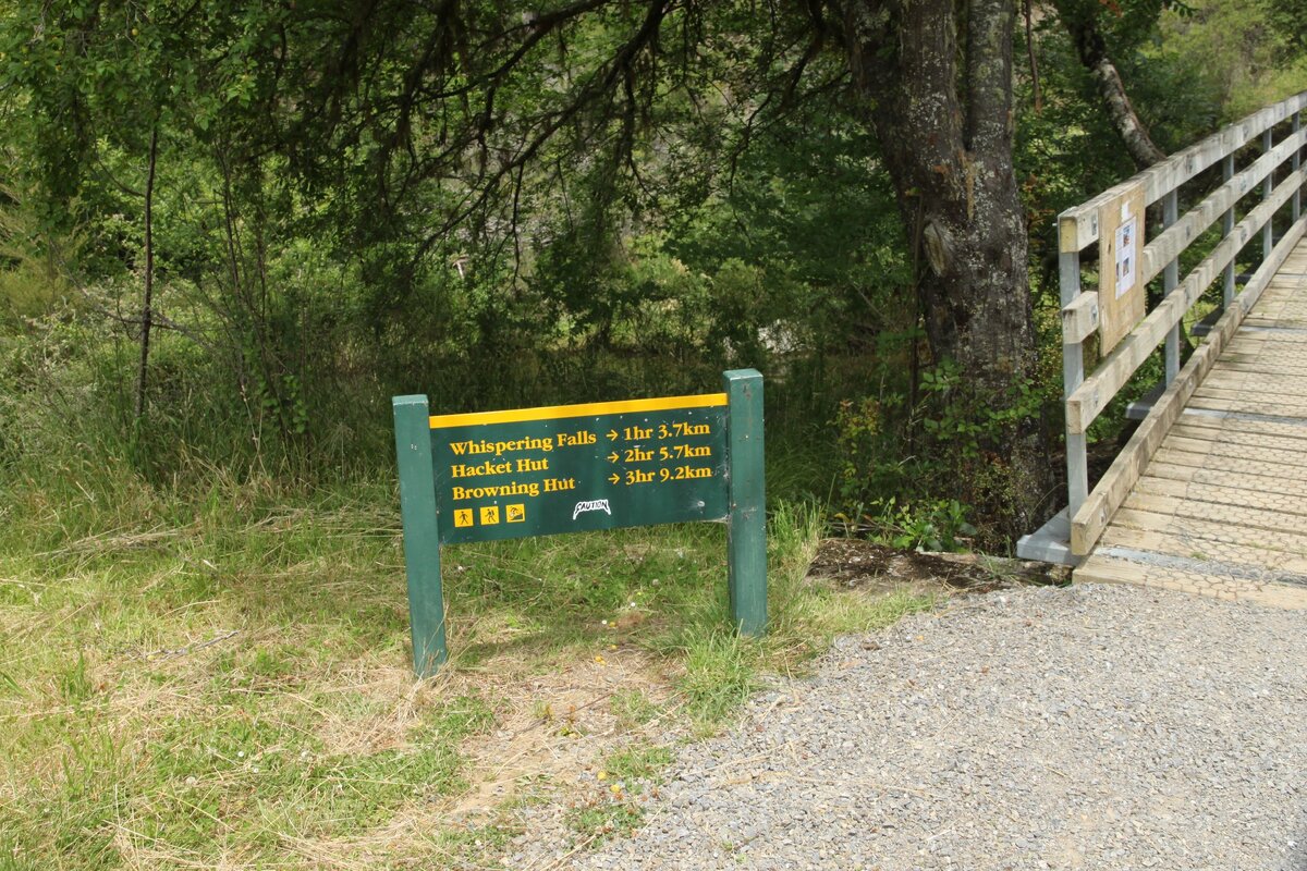 В 2013 - 2016 годах я жил в Екатеринбурге и ходил в спортзал. Беговые дорожки в зале были с дисплеями, где во время тренировки я любил смотреть ролики, как-будто бежишь по какому-то городу или парку. Как-то раз я так "прогулялся" по одному из треков Новой Зеландии, и с тех пор эта страна поселилась в моей голове :) И вот спустя три года мы живем в Новой Зеландии, и можем сколько угодно наслаждаться красивыми маршрутами. Сегодня пройдемся по треку Hacket Hut, расположенному недалеко от города Ричмонд. Это маршрут протяженностью 5,7 км, то есть занимает примерно два часа в одну сторону. Hut - это значит, что в конце маршрута есть хижина, в которой можно остановиться на ночь, или просто отдохнуть и погреться. Вот на эту хижину мы и посмотрим. Идем вот сюда. Река Roding и впадающие в нее ручьи будут сопровождать нас на протяжении всего маршрута. Симпатичный подвесной мост, выдерживающий вес пяти человек. Трек и река идут параллельно. Все сложные участки отмечены предупреждающими знаками