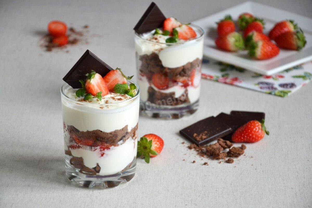 Наступило время готовки всяких вкусностей. Каждая хозяйка старается впечатлить своими кулинарными способностями дорогих гостей. Запеченное мясо, румяная курочка, салаты, торт… Ух, а на торт сил и времени уже и не осталось. В этом случае, приготовьте простейший десерт с клубникой. По вкусу он ничем не уступает кремовым сложным тортам. При этом готовить его легко и быстро. Ничего взбивать, выпекать не требуется, охлаждать в холодильнике всю ночь также. Всего лишь ломаем печенье, нарезаем свежую клубнику, смешиваем сметану с пудрой и ванилином. Формируем вкуснятину слоями. Готово. Всего полчаса времени и чудесный, ароматный десерт готов! При этом вы с ног не валитесь. До прихода гостей осталось достаточно времени, чтобы отдохнуть и принарядится!) Время приготовления 30 минут Калорийность 245 ккал/100 г Ингредиенты (3 порции) · песочное печенье – 100 г; · клубника – 200 г; · ванильный сахар – 1 ч. л; · сахарная пудра – 3 ст. л; · сметана (20%) – 350 г Для украшения · темный шоколад – 2