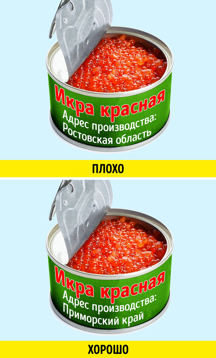 1) Обращайте внимание на место производства Натуральная икра упаковывается там же, где и добывается. Лучшие места для добычи икры - Дальний восток, рядом с островом Сахалин, и конечно же на Камчатке. А если на банке с икрой указано другое место, то вероятнее всего данная икра прошла не один процесс заморозки и размораживания до места расфасовки. 2) Выбирайте стеклянную или жестяную тару Натуральную икру чаще всего фасуют в стеклянную или жестяную тару - так она сможет дольше храниться. Важно обратить внимание на то, что железная тара не должна быть вздутой. Покупать икру на развес - занятие достаточно рисковое, ибо есть много уловок что бы вернуть свежесть даже несвежей икре. 3) Избегайте неконкретной надписи «Икра лососевая» Рыб данного семейства очень много и натуральную икру в основном смешивают в пределах своего семейства. На натуральной икре конкретно указывают вид рыбы, или несколько рыб. А вообще, икру лучше выбирать с имеющимся качеством знака ГОСТ. 4) Потрясите ба