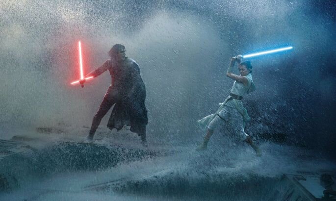 Кайло Рен (Адам Драйвер) и Рэй (Дэйзи Ридли) сражаются на фоне девятых валов и волн Хокусая.
