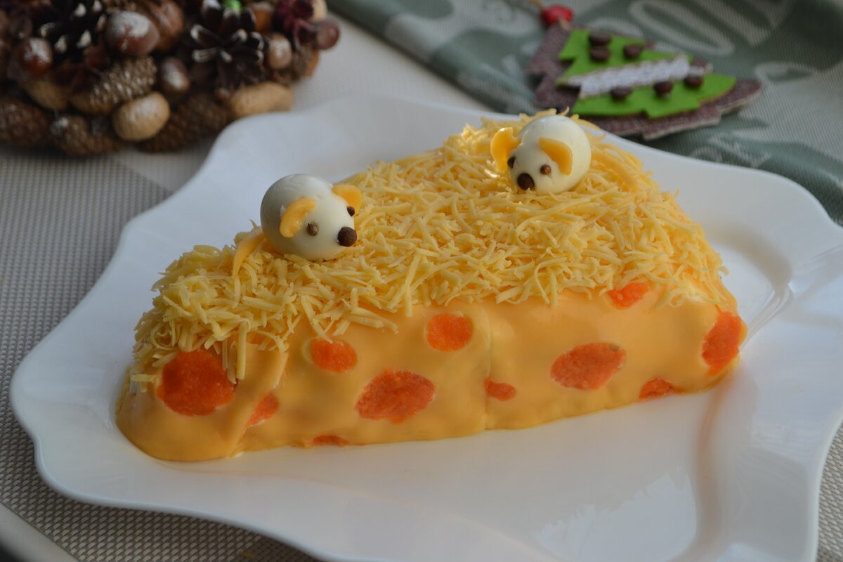 Так как символом нового года является - крыса, предлагаю приготовить салат кусочек сыра для мышек, он очень легкий в приготовлении, максиму что нужно это немного творческих усилий. В моем рецепте расчет ингредиентов на 4 взрослых человек. Ингредиенты: Картофель - 100 грамм Морковь - 100 грамм Колбаса вареная -120 грамм Огурец (свежий) -100 грамм Яйцо - 2 штуки Сыр ломтевой - 6 штук ( 1 упаковка) Сыр твердый - 50 грамм Майонез - 3 столовые ложки Йогурт - 3 столовые ложки 2 перепелиных яйца для мышек. Первым делом смешиваем майонез с йогуртом, я помещаю заправку в полиэтиленовый уголок. Картофель отварить, порезать на мелкие кубики, слой заправки Морковь отварить, порезать на мелкие кубики, слой заправки Колбасу порезать на мелкие кубики, слой заправки Огурец порезать тоже мелкими кубиками, сверху заправляем заправкой Желток отделяем от белка и натираем на мелкой терке, заправкой не заправляем Далее укладываем натертые на крупной терке белки, наносим заправку Все бока салата тоже сма