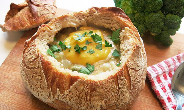- Непосредственно перед подачей заправьте смесь в буханку. Подавать с порванными ломтями из хлеба и овощами.