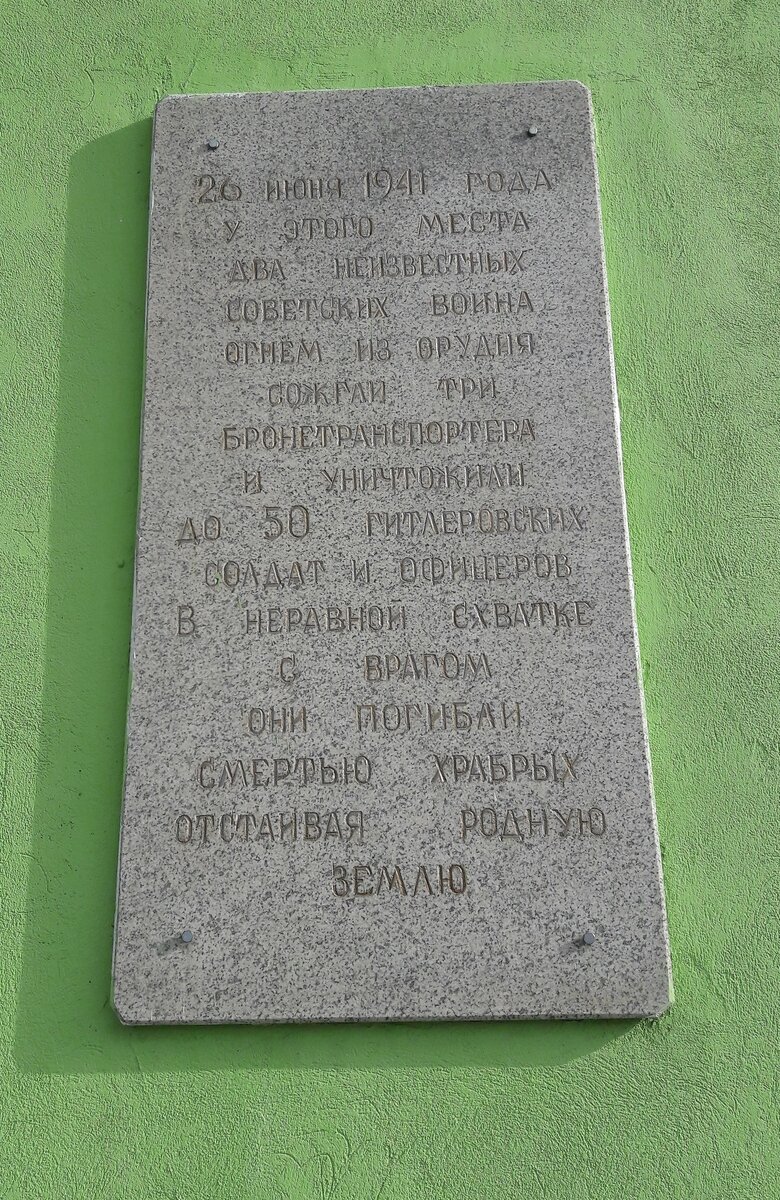 Здесь, у этого места, 26 июня 1941 года два неизвестных советских воина огнем своего орудия сожгли три немецких бронетранспортера и уничтожили до 50 гитлеровских солдат и офицеров. Когда закончились снаряды, герои, один из которых был ранен в голову, продолжали бой,