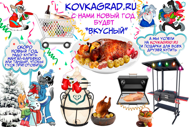 Гусь, приготовленный на мангале под крышкой гриль-барбекю станет вкусным украшением новогоднего стола. Для его приготовления нужно купить самого свежего и упитанного гуся, полкилограмма кисло-сладких яблок, две штуки айвы. гранат, масло сливочное или жирную сметану, и специи - соль, перец, кориандр, пару стручков жгучего перчика и базилик. А любители печеных овощей могут сделать и гарнир из печеных перца болгарского, баклажан и помидор. На решетке достаточно места, чтобы Вы могли разложить и гуся и отдельно фрукты и овощи. Если пожелаете, то можете приготовить отдельно рис. Его следует предварительно отварить, а минут за 15 до готовки "запихать" в гуся. Гусь вначале должен немного промариноваться в смеси из масла или сметаны со специями. Жарить его следует под закрытой крышкой, но обязательно через 20 мин гуся следует перевернуть и в это же время можно уложить на решетку овощи и фрукты, им требуется меньше времени для запекания, ну и нашпиговать рисом по желанию.