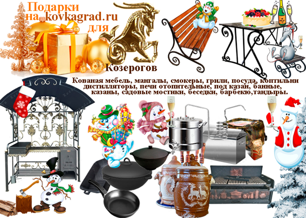 Подарки Козерогам на КовкаГрад в Год Белой Металлической Крысы Козероги еще будут находится в старом году, для них год Крысы, который наступает только 25 января будет уже в конце следующего года. Но влияние Свинки уже угасает, а Крыса вот- вот на подходе, поэтому можно и для Козерогов посмотреть подарок на Новый Год или на День рождения уже по новому знаку. А новый знак обожает металл. И вот тут есть большой выбор на сайте kovkagrad.ru, куда мы приглашаем пройти по данной ссылке и выбрать подарок. А поскольку Козероги по гороскопам люди рассудительные и они могут очень рационально распределять свое время, то и отдыхать они предпочитают с комфортом. и у домашнего очага. А еще они любят правильное питание. В нашем магазине Вы найдете много товаров, которые помогут и тепло создать и обед приготовить. Купить мангал для Козерога на КовкаГрад Мангалы, которые можно заказать в подарок можно разделить на несколько категорий. Есть кованые мангалы, которые изготавливаются и с крышей и без нее.