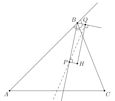 Сегодня, как и обещал в предыдущем посте, разберу задачу с петербургской олимпиады 94-го года. На мысли о ней меня вывела задача с турнира городов этого года. Задачи очень похожи внешне, хотя напрямую друг из друга не следуют. Но, что на мой взгляд гораздо важнее, очень и очень похожи по решению. Однако, мне кажется, что классическая задача с питерской олимпиады все-таки посложнее... Как и в предыдущей задаче надо заметить, что много точек лежат на одной окружности. Если описать окружность около прямоугольника HPBQ (угол между биссектрисами внутреннего и внешнего угла, конечно, прямой), то она пройдет и через основания высот треугольника --- точки D и E. И, как и в предыдущем решении, диаметр PQ является серединным перпендикуляром к отрезку DE, поскольку P --- середина дуги DHE, а Q --- середина дуги DBE. Осталось проверить, что серединный перпендикуляр к ED пересекает сторону AC в середине. Это так, поскольку точки E и D лежат на окружности с диаметром AC.