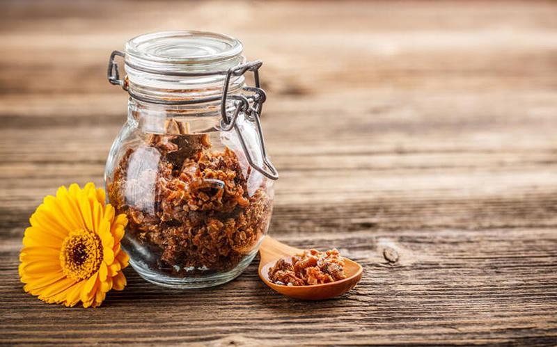 Прополис, или пчелиный клей, представляет собой смолистое вещество, вырабатываемое рабочими пчелами. Он имеет приятный аромат, горьковатый вкус и клейкий на ощупь. При нагревании быстро делается мягким, а при охлаждении превращается в хрупкую, подобную канифоли массу темного цвета с коричневым до зеленоватого оттенком. В состав прополиса входят растительные смолы, эфирные масла, воск, пыльца цветов, секрет слюнных желез пчел, бальзамы, витамины А, С, группы В, микроэлементы, коричный спирт, различные кислоты, дубильные вещества. Полностью этот продукт пчеловодства еще не изучен. При сжигании кусочка прополиса появляется типичный запах ладана. Основное лечебное достоинство прополиса — высокое антимикробное действие. Он применяется при лечении болезней кожи, туберкулезе, грибковых и воспалительных заболеваний слизистой оболочки рта, верхних дыхательных путей и др. Микробиологами установлено бактерицидное воздействие водного экстракта прополиса более чем на 100 видов микроорганизмов,