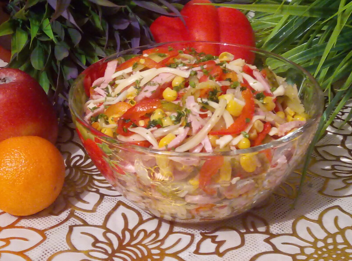 Салат" Мехико" из копчёной колбасы с овощами и сыром