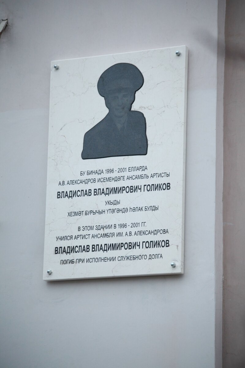 Сегодня исполнилось три года со дня трагедии над Черным морем. На историческом здании Казанской консерватории установили мемориальную доску Владиславу Голикову – артисту Краснознаменного академического ансамбля песни и пляски Российской армии имени А.В.Александрова. Ранним утром 25 декабря 2016 года музыкант находился на борту авиалайнера, направлявшегося в Сирию для новогоднего поздравления российских военных на аэродроме Хмеймим. Через несколько минут после взлета из аэропорта в Сочи самолет рухнул в Чёрное море… Погибли 8 членов экипажа и 84 пассажира, в их числе почти полный состав ансамбля песни и пляски Российской армии. Церемония открытия мемориальной доски состоялась 23 декабря. Почтить память земляка собрались представители сферы культуры, коллеги, родственники, друзья. В фойе корпуса консерватории на улице Пушкина был установлен экран, на котором демонстрировались видеозаписи выступлений Владислава Голикова вместе с Ансамблем песни и пляски, а также его исполнение фрагментов