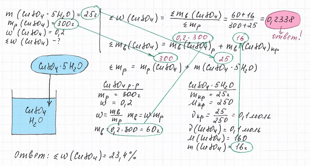 Определите массовую долю сульфата меди (II) в растворе, полученном при растворении 25 г медного купороса в 300 г раствора сульфата меди (II) с массовой долей соли 0,2