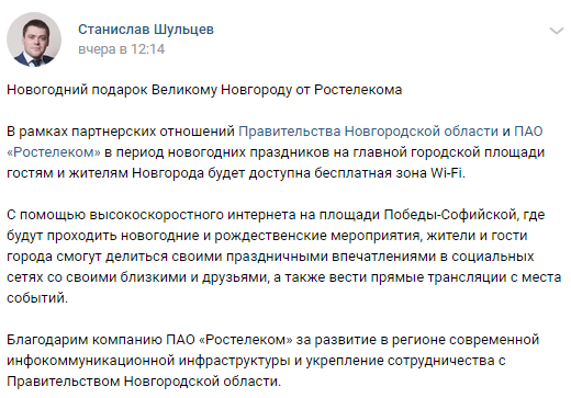 Министр транспорта Новгородской области Станислав Шульцев сообщил на своей странице «ВКонтакте» о новогоднем подарке для новгородцев от «Ростелекома». На новогодние каникулы на Софийской площади будут раздавать бесплатный Wi-Fi. Шульцев сообщает, что такой подарок стал возможен благодаря партнерским отношениям регионального правительства и «Ростелекома». Напомним, ранее бесплатный беспроводной интернет провели в некоторые парки Великого Новгорода, но работал он с перебоями. Больше новостей на https://parohod.online/