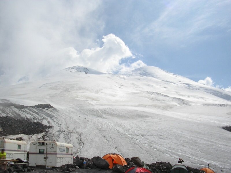 Не буду описывать дорогу до базового лагеря — это была бы реклама водителей компании и «УАЗ-Патриотов». Лагерь находится на высоте две тысячи шестьсот метров. Иногда, когда наверху не было тумана, мы видели заснеженную вершину со скалами Ленца, и думали, что это и есть вершина Эльбруса. На второй день мы совершили небольшую прогулку в горы и поучились ходить с трекинговыми палками. На третий день мы забрасывали часть снаряжения в штурмовой лагерь на высоте три тысячи восемьсот, и это было уже довольно тяжело. Я слушал советы гида: в горах время работает против тебя, и не надо его тратить. Если остановились на привал, сразу же используй время с пользой: пей, например, если тебе надо.