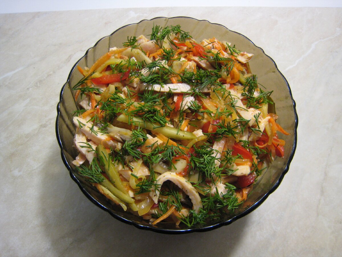 Салат с копчёной грудкой по рецепту читателя канала - Ольги. Вкусно и сытно. Пошагово - с фото.