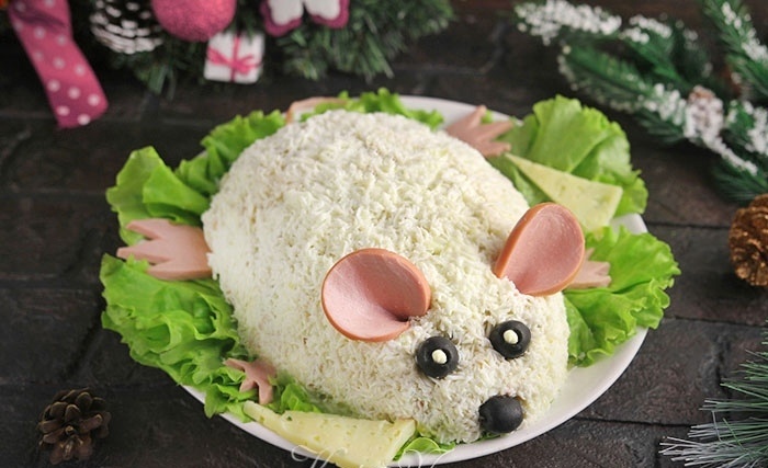 🐁 😻 Салат Крыса на Новый год 2020 😻 🐁 Традиции — дело святое! И то, что на новогоднем столе должен присутствовать символ наступающего года, уже давно стало обычаем для всех хозяек, внимательно следящих за сменой зодиакальных созвездий и животных — элементов Восточного гороскопа. Чем порадовать умную, хитрую, хозяйственную Крысу? Разумеется, приготовить роскошный и вместе с тем простой и экономный салат Крыса на Новый год 2020! Ингредиенты: ❄ колбаса вареная — 250 г; ❄ картофель — 350 г; ❄ кукуруза консервированная — 180 г; ❄ яйца — 4 шт.; ❄ маринованные огурцы — 150 г; ❄ сыр — 100 г; ❄ лук репчатый — 50 г; ❄ уксус винный — 1 ч. ложка; ❄ майонез — около 200 г; ❄ соль, перец — по вкусу. Для оформления: ❄ колбаса вареная — около 50 г; ❄ маслины — 3 шт. Приготовление : Заранее отвариваем и остужаем картофель и яйца. Удобно это сделать накануне вечером, оставив на ночь в холодильнике — в таком случае время на приготовление салата заметно сокращается, а охлажденн