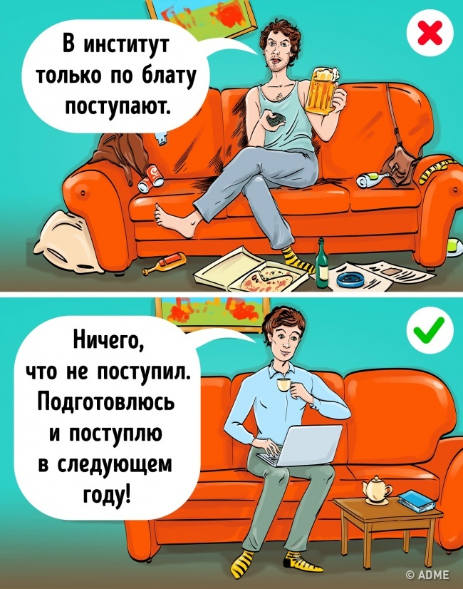 Артур Шопенгауэр говорил, что трусы рождают трусов, подлецы — подлецов, а у неудачников на свет появляются только неудачники. А вот Иммануил Кант полагал, что характер не передается по наследству, а формируется под влиянием внутренних переживаний и внешних обстоятельств, и над ним можно и нужно работать. Но есть и еще одна теория: человек не причастен к тому, что происходит в его жизни, и все неудачи — это происки врагов и влияние звезд. Как правило, этой теории придерживаются закоренелые неудачники. 1. Обвинять окружающих в своих бедах Не поступил в институт? Потому что туда берут только по блату или за взятки. Не дали премию на работе? Идиот-начальник награждает только родственников и подхалимов. Бросила девушка? Это из-за того, что она дура (если бросил парень — «он козел»). Дома закончился хлеб и в магазине его тоже нет — вот оно, явное доказательство вселенского заговора! 2. Сравнивать себя с другими людьми Аутсайдеры любят сравнивать себя с другими. Вне зависимости от т