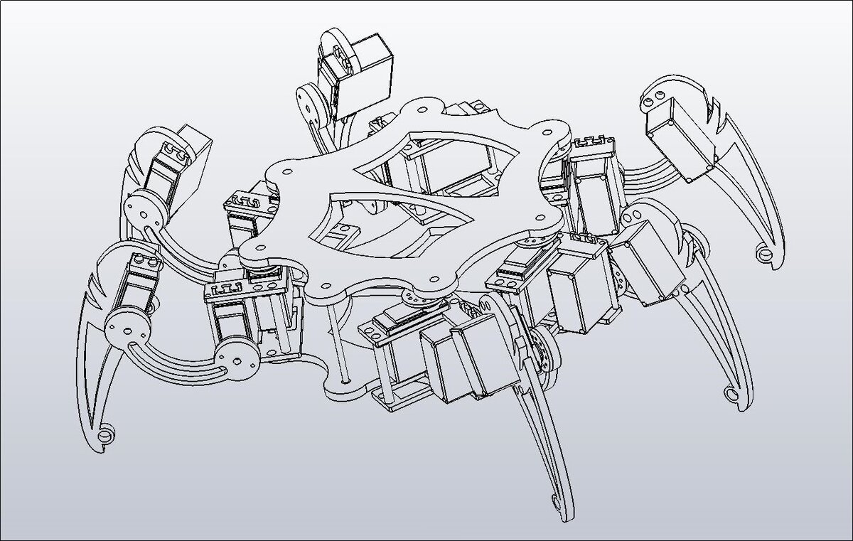 В качестве изначальной конструкции был выбран один из открытых проектов с сайта grabcad.com. Было это относительно давно, еще до повального интереса к подобным шестиконечным устройствам. Поэтому выбор из существующих открытых проектов на тот момент был не велик, а разрабатывать свою первую робототехническую конструкцию подобного уровня с нуля было весьма затруднительно. Проект был доработан в сторону уменьшения веса конструкции и упрощения краевых линий деталей. Ниже приведен изометрический вид манипулятора в программном продукте SolidWorks (одна из предпоследних версий модификации; самую последнюю, по прошествии стольких лет, найти так и не получилось):