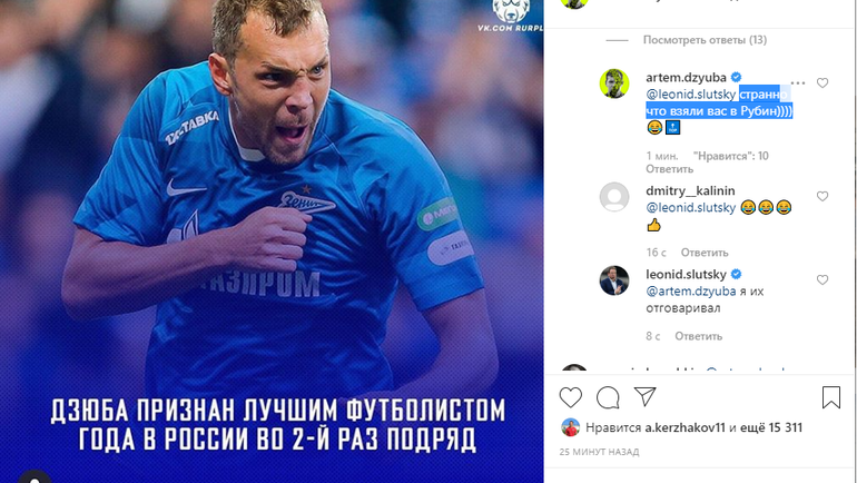 — Странно, что взяли вас в «Рубин»)))), — последовал ответ от Дзюбы.