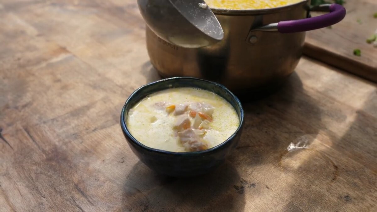 Ингредиенты : Лук 2-3 луковицы Лосось, либо форель. 2-3 картофеля 1 крупная морковь Перец Соль 250гр сливочного масла 0.5 воды 1л сливок Зелень для украшения Рецепт: Лук нарезать мелкими кубиками, либо полу кольцами смотря по предпочтениям. Картошку также нарезать небольшими кубиками. Морковь натереть на крупной тёрке. На сковородку добавляем растительное масло ложек 5,как минимум. На сковородку выкладываем морковь с луком, и сверху кусок масла. В процессе хорошенько солим. Перемешиваем. Ждём пока лук подзолотится, и закидываем картофель, делаем до полу готовности. Наливаем в кастрюлю воды. Режем лосось кубиками, чуть больше картошки. И солим его слегка. Когда вода закипела, бросаем туда овощи. Ждём пока снова закипит. Добавляем сливки. Ждём пока они прогреются, но не до кипения.Кидаем лосось и сразу выключаем. Зелень по вкусу. В конце пробуем на соль.