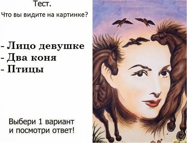 Судьба человека — это сложная и запутанная история, в которой много тупиков и перекрестков. При этом, наверно, нет на свете человека, который не хотел бы узнать о себе и своей жизни что-то новое и пока загадочное. Для этого каждый может использовать чертоги своего подсознания. Так, с помощью подсознания и картин-тестов, можно узнать то, что никому пока не раскрыто. Взгляните на картинку и ответьте на вопрос. Тест точен на 96%! Лицо девушке — прекрасное, открытое лицо с бесхитростным взглядом означает, что вы можете без всяких опасений участвовать в любых развлечениях в ближайшем будущем. Напротив, уродливое, хмурое и сердитое лицо предвещает крайне неприятные события. Два коня — Символ благородства, грации и быстроты. Образ коня говорит о том, что в жизни вы столкнулись с человеком, олицетворяющим все эти прекрасные качества. Так же может указывать на тяжелую работу. Птицы — в ближайшее время вы сможете исполнить свою мечту. Это произойдет вскоре после того, как к вам в руки упадет п