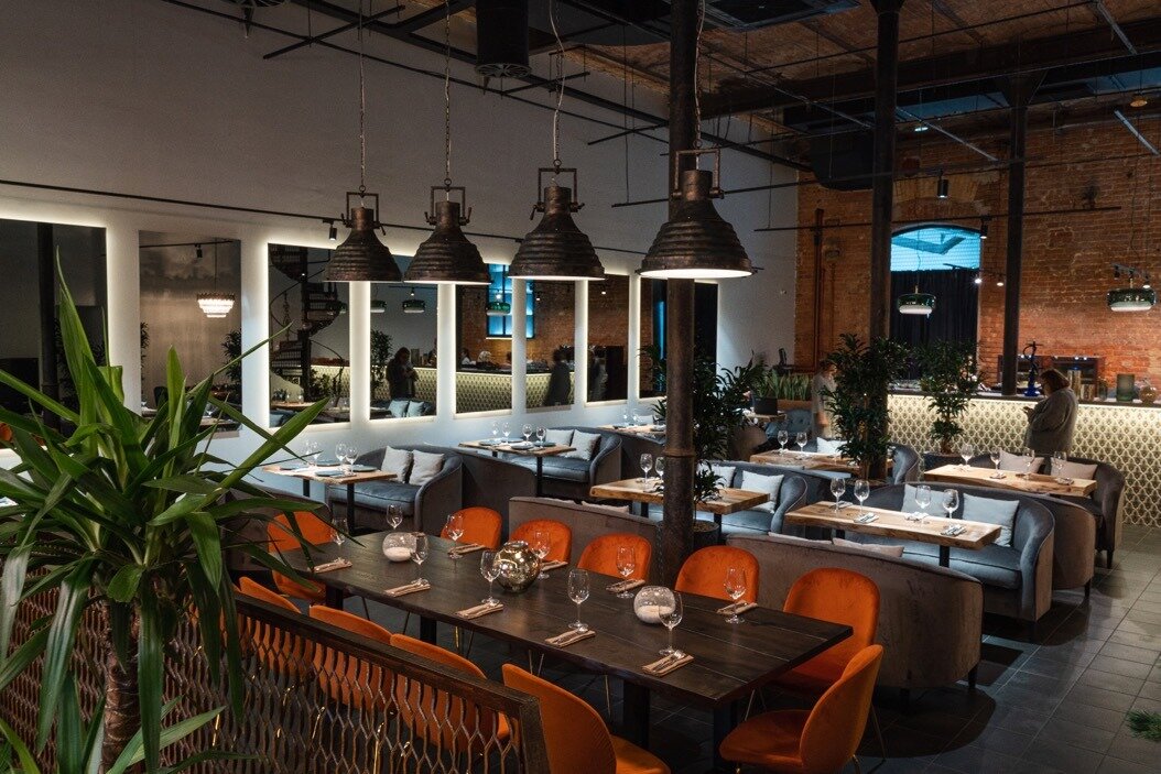 Все блюда готовят на открытой кухне, которая отделана марокканской плиткой. Как признаётся Оксана, интерьер в пространстве тарного цеха Бадаевского завода не сколько строили, сколько восстанавливали: например, сохранили и кирпичные своды Монье, и пятиметровые потолки, и окна, расположенные по принципу золотого сечения, и стены из красного кирпича. А чугунную винтовую лестницу воссоздали из деталей XIX века.