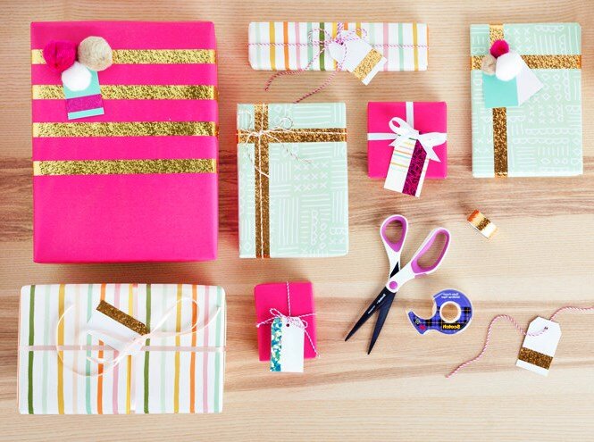 Пригодятся ненужные в хозяйстве коробки (например, для обуви) и разноцветные клейкие ленты. С их помощью можно нанести на коробку рисунок ─ елку или бант ─ и обклеить по периметру или диагонали, имитируя декоративную ленту.