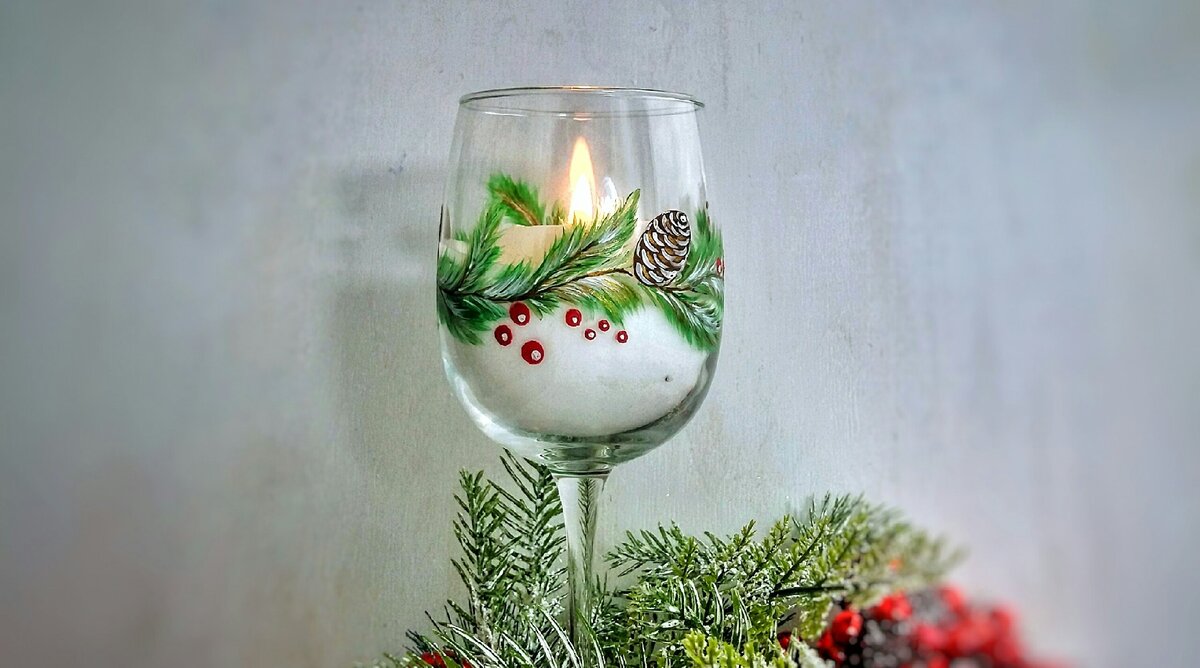 Видео! Зимний рисунок на бокале. Простая новогодняя роспись для начинающих.