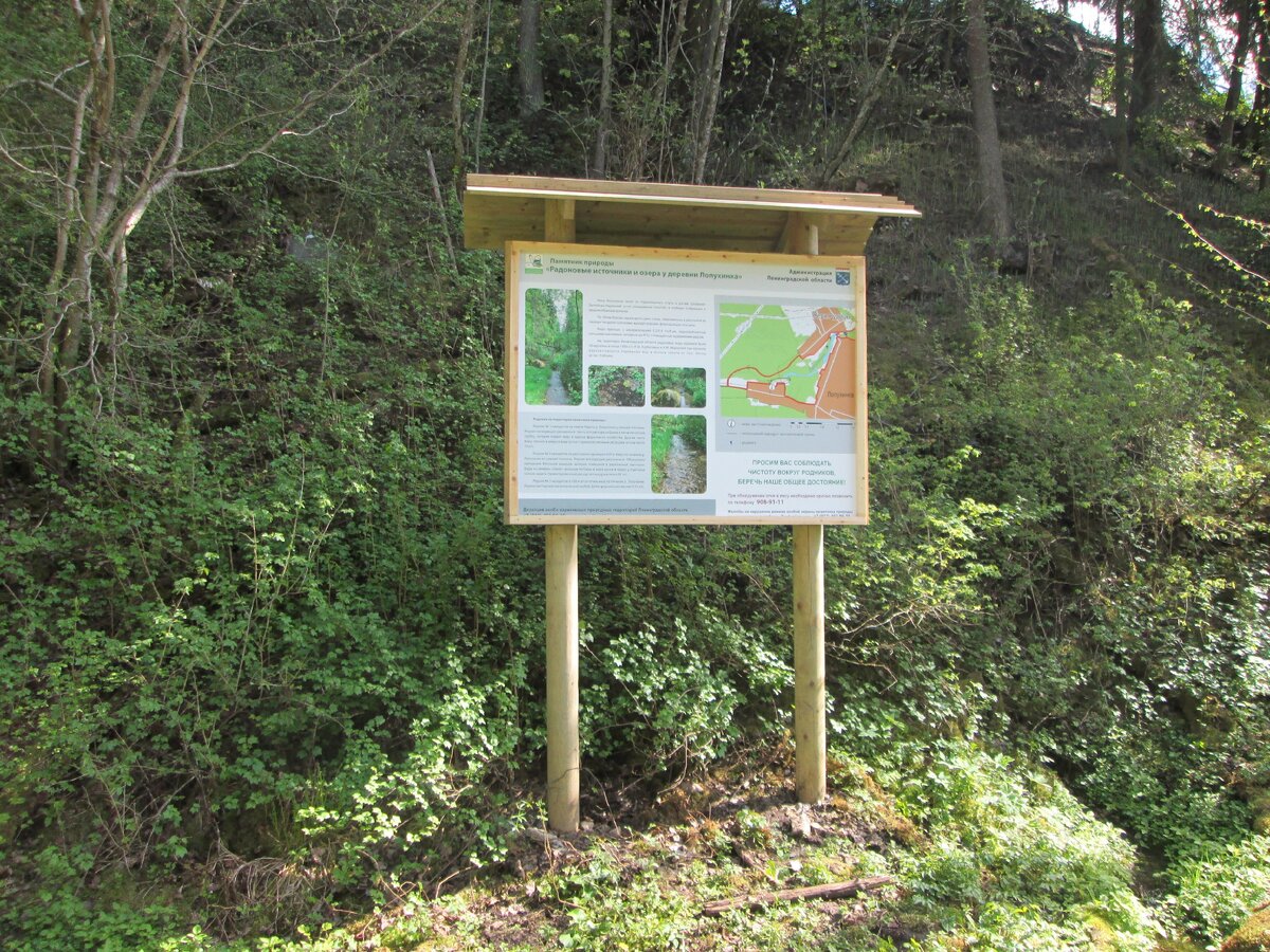 При подъезде к радоновым озерам установлен знак Сами по себе Радоновые родники и озера в деревне Лопухинке Ленинградской области особо охраняемый памятник природы, находящийся в паре часов езды от Санкт-Петербурга. Еще в XIX веке в этих местах располагалась лечебница, в которой моряков лечили обертыванием простынями, смоченными в местной воде. Это давало положительные результаты при лечении ревматизма. А еще через столетие ученые обратили внимание на отсутствие в Лопухинском озере какой-либо растительности и планктона. По этим признакам был сделан вывод, что источники содержат в себе радиоактивный элемент — радон. У озер приведен в порядок источник, где местные жители набирают воду, а так же могут искупаться выведена труба для набора воды Очень живописные места и озеро в деревне Лопухинки на этом все, спасибо за внимание!