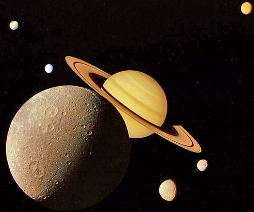 Сатурн хоть и меньше Юпитера, и тусклее - но зато с грандиозными внешними кольцами и десятками спутников разных размеров и форм: