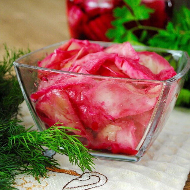 Пикантная холодная закуска из капусты! Подходит ко всем видам картофеля , к любому виду мяса и рыбы! Готовится очень просто ! Получается очень вкусно ! Порция на 1.5 литровую банку. Ингредиенты : вода - 0.5 л капуста - 750 гр ( 1 маленькая ) свекла - 1 ( маленькая ) чеснок - 2 зубка лавровый лист - 1 шт соль - 1 ст.л. с горкой сахар - 1.5 ст.л. масло растительное - 50 мл уксус 9% - 80 мл перец чёрный горошком