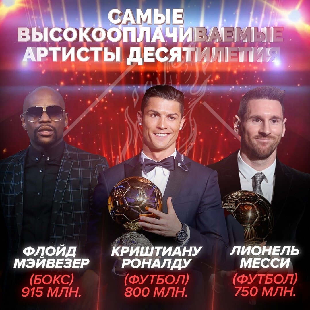 Флойд Мейвезер заработал 915 000 000 долларов; Криштиану Роналду — 800 000 000 долларов; Лионель Месси — 750 000 000 долларов. 🏆 В список также вошли: Баскетболист Леброн Джеймс – $680 млн; Теннесист Роджер Федерер – $640 млн; Гольфист Тайгер Вудс – $615 млн; Гольфист Фил Микельсон – $480 млн; Боксер Мэнни Пакьяо – $435 млн; Баскетболист Кевин Дюрэнт – $425 млн; Гонщик «Формулы-1» Льюис Хэмилтон – $400 млн долларов;