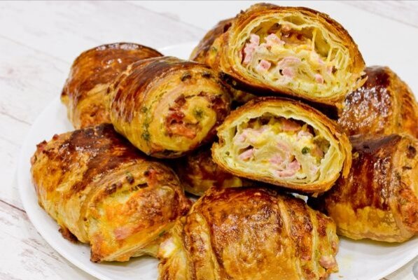 Если нет времени долго возиться с тестом, а хочется побаловать своих близких вкусной выпечкой, то этот рецепт из готового слоёного теста для вас! Слойки в виде рулетиков с начинкой из сыра и ветчины готовятся максимально просто и легко, получаются очень вкусными, сочными, просто идеальны для завтрака, перекуса или подачи к первым блюдам вместо хлеба! Ингредиенты : Тесто слоёное бездрожжевое - 450 г. Ветчина - 150 г. Сыр твёрдый - 100 г. Майонез - 2 ст. ложки. Укроп свежий - 2-3 веточки. Петрушка свежая - 2-3 веточки. Желток - 1 шт. Приготовление : Подготовьте все ингредиенты, необходимые для приготовления закусочных слоек-рулетиков. Готовое слоёное тесто нужно заранее достать из холодильника. Ветчину (или ветчинную колбасу) нарежьте мелкой соломкой или натрите на крупной тёрке. Твёрдый сыр натрите на крупной тёрке. В миске соедините ветчину и сыр, перемешайте Укроп и петрушку (или любую другую зелень) промойте, измельчите. Соедините измельчённую зелень с майонезом и перемешайте.