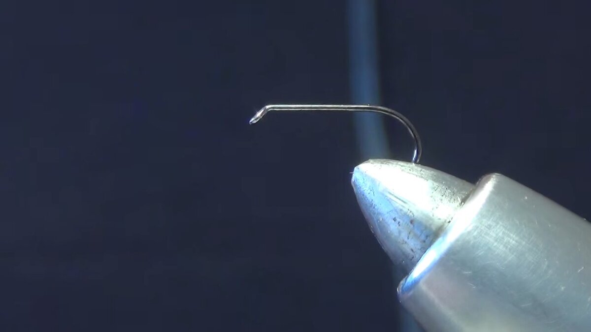 Закрепляем крючок в тисках. Берём монтажную нить, фиксируем её возле ушка и уводим до изгиба, делаем узел и нить обрезаем. Далее наносим каплю уф геля на цевьё крючка. Сушим уф фонариком. Чёрным маркером красим каплю. Теперь гелем покрываем покрашенную капельку и сушим. Наносим вторую капельку уф геля и сразу сушим. Вторую каплю красим красным маркером. И так же покрываем каплю гелем и сушим. Теперь берём монтажную нить и фиксируем между капельками.