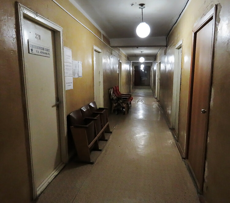 В навигаторе мы нашли в нём несколько гостиниц, но ни в одной из них не отвечал телефон. Сначала заехали по адресу на объездной, но там обнаружилась лишь грязная придорожная кафешка. Там сидели люди с лицами ордынцев, только что взявших Москву, и хозяйка при виде приличных людей (если таковыми можно считать нас) так испугалась, что спряталась на кухне. Вторая гостиница оказалась просто запертой. Местные же отправили нас в профилакторий "Дельфин" близ вокзала, оказавшийся снаружи и внутри мрачной общагой с тёмной лестницей и железной дверью.
