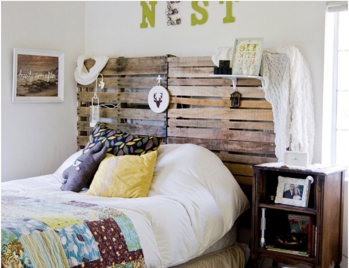 Очень простая идея: изголовье из грузовых поддонов (паллет). На досках вы можете развесить разные декоративные вещицы: растяните нить с китайскими фонариками или миниатюрную гирлянду для атмосферы. Продернутые между досками полоски лент или ткани тоже будут хорошим декором.