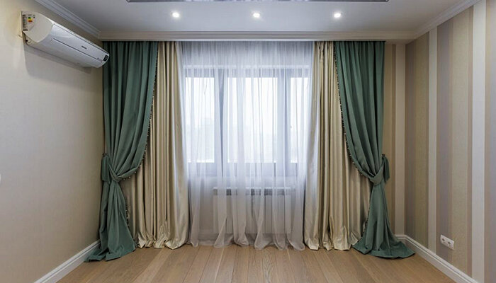 Этот вариант предполагает некоторые нюансы. Например, для маленьких комнат шторы можно подобрать идентично цвету стен, в результате чего они с ними сольются, и визуально раздвинут границы небольшого помещения.