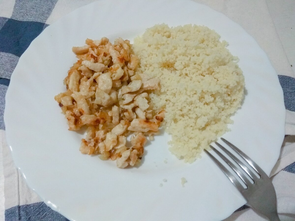 Из-за дополнительных занятий в школе приходится приносить домашний, горячий обед дочке в школу. А времени порой не хватает, с годовалым ребенком не всегда во время успеешь приготовить. Этот обед на скорую руку можно приготовить очень быстро, гарнир готовится в течении 5 мин и горячее можно любое мясо, но курица быстро жарится. Я делаю всегда в курицей, дочка очень любит, хотя жуткая привереда. Секрет в том , что лук режу мелко -мелко и его практически не видно в курице. КУСКУС - крупа из твердых сортов пшеницы- символ восточной кухни. ******************************************************************************* Что нужно для обеда, пропорцию не пишу т.к предельно просто и на разный аппетит кус-кус куриное филе лук чеснок масло сливочное Куриное филе режем мелко, так быстрее прожарится. Лук и чеснок мелко шинкуем, я уже говорила моя дочка не любит лук, и если увидит, выкладывает его. В сковороду добавляем слив.масло ( на нем вкусно, у меня деревенское из сливок )))) но можно топле
