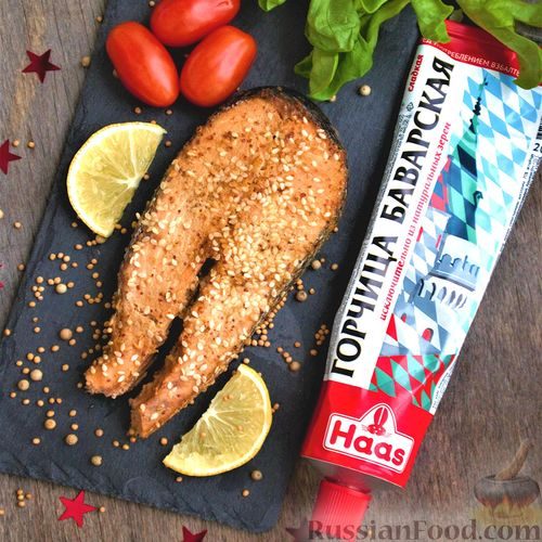 Побалуем себя и своих близких в преддверии новогодних праздников чем-то особенным, тем более что с рецептами от Нaas можно создавать потрясающе вкусные кулинарные шедевры быстро и без хлопот! Сегодня у нас — рыбная тема, поэтому готовим стейки кеты в горчичном маринаде. Кета, приготовленная таким образом, выглядит очень аппетитно, а маринад делает рыбу необыкновенно нежной и вкусной. Мы начинаем! Нам понадобится: Кета (стейк) — 600 г Горчица (ТМ Haas Баварская) — 2 ст. ложки Сок лимонный — 2 ст. ложки Соевый соус — 1,5 ст. ложки Масло оливковое — 1 ст. ложка Кунжут — 1 ст. ложка Приготовление: 1. В миске соединить соевый соус, лимонный сок, оливковое масло и баварскую горчицу. Хорошо перемешать. 2. Стейки кеты обмазать приготовленным маринадом с двух сторон иоставить на 20-25 минут, чтобы пропитались. Разогреть духовку до 180 градусов. 3. Далее выложить стейки в форму для запекания (силиконовую форму можно ничем не смазывать и не застилать). 4. Посыпать рыбу кунжутом. 5. Запекать стейк