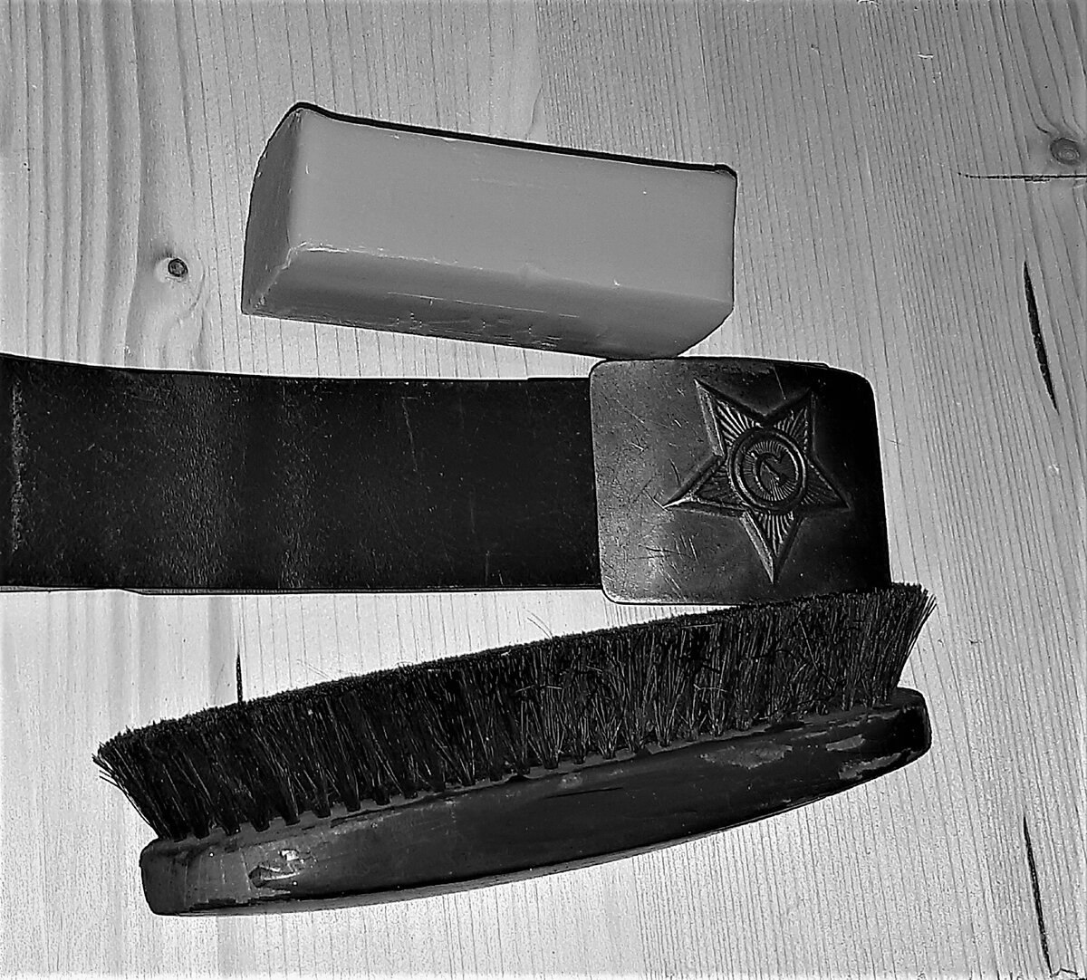 Технология стирки была простой. Нужно было намочить галифе или гимнастёрку в раковине, положить её на табуретку, положить сверху кусок хозяйственного мыла и «размылить» его своей сапожной щёткой. После этого, этой же щёткой нужно было как следует намылить и растереть мылом всю поверхность одежды с обеих сторон. После того, как форма была как следует намылена и прочищена щёткой, она промывалась в той же раковине.