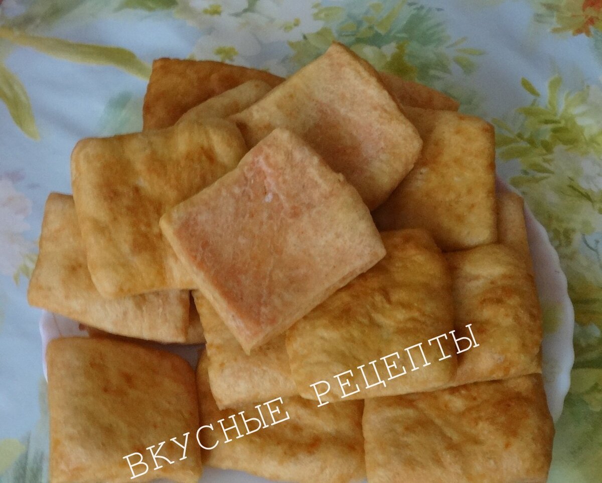 Собираетесь в дорогу? Возьмите с собой снэки. Снэки - это продукты для быстрого и легкого утоления голода, закуски, употребление которых происходит между делом, на ходу. Продукты: 300 г муки, 0,5 чайной ложки разрыхлителя, можно взять соду, 0,5 чайной ложки ванильного сахара, 30 г сахара, щепотка соли, 1/4 чайной ложки куркумы (для цвета), 70 г сметаны, 130 мл тёплой воды. Приготовление: Все сухие продукты перемешать. Добавить сметану. Дальше всё размешиваем руками. Постепенно вливаем тёплую воду, может оказаться лишняя. Тесто должно быть мягким, не прилипать к рукам. Даём тесту отдохнуть минут 20-30. Отрезаем часть теста, раскатываем на сухом столе. Толщина должна быть примерно полсантиметра. Нарезаем квадратами 5 см х 5 см. Пусть постоят минут 5. Разогреваем сковородку, наливаем масло, чтоб снэки в нём плавали. Это примерно 1 см. Жарим с двух сторон. Переворачиваем, когда увидим, что цвет стал красивый. Достаём на тарелку, застеленную бумажной салфеткой, чтобы стекало лишнее