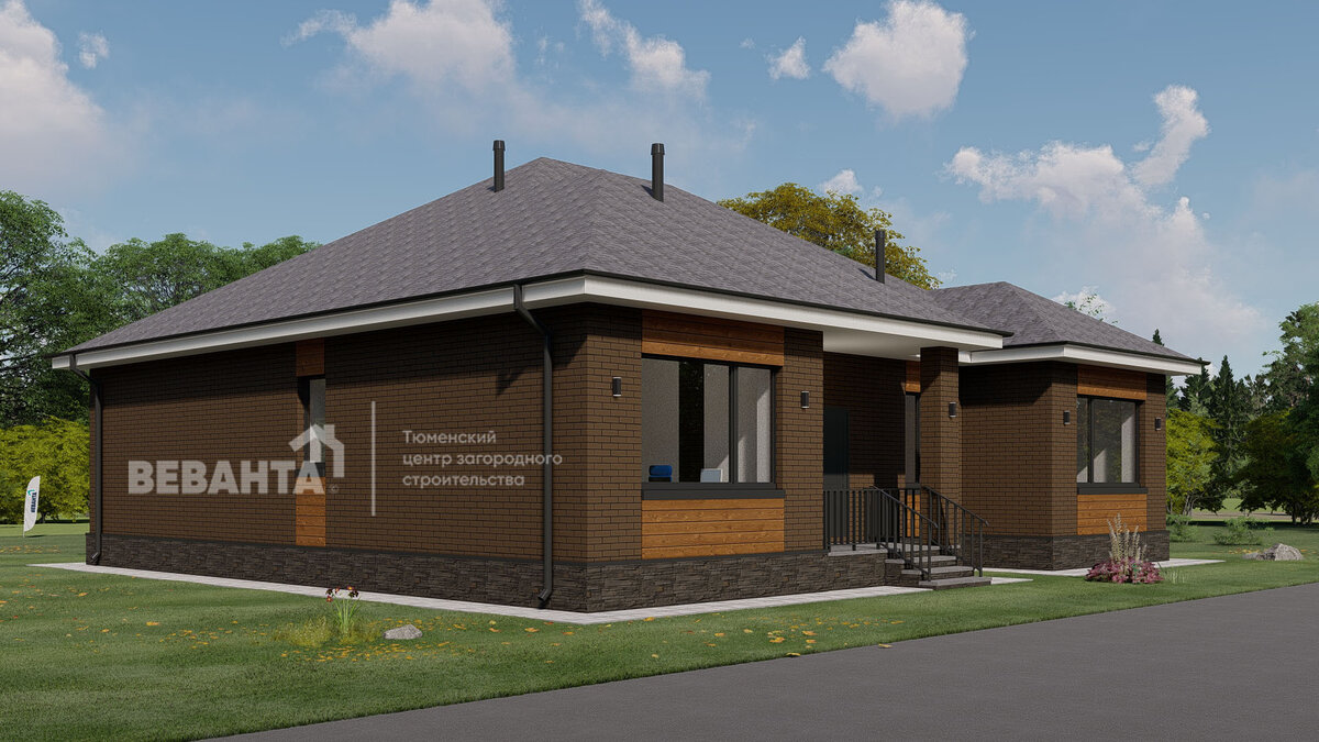 Линейку самых востребованных одноэтажных домов пополняет новый проект архитекторов «Веванта» «Сказка» 135,2 м2, с четырьмя спальнями и двумя санузлами. Общая площадь дома по проекту «Сказка» составляет 135,2 м2 + терраса 25.2 м2 + крыльцо 6,19 м2. Габаритные размеры дома — 12,86 х 14,55 м. Количество жилых комнат – 4. Количество санузлов – 2. Материал несущих стен – керамзитоблок. Тип фундамента — ленточный на буронабивных сваях. Тип кровельного покрытия — гибкая черепица. Облицовка стен – керамический кирпич «ЛИКолор» цвета «Шоколад» и фасадная доска — планкен прямой из лиственницы. Срок реализации проекта составляет 4 месяца. Одноэтажный дом по проекту «Сказка» отличается необычными, стильными фасадами и удобной планировкой. При входе в дом – крыльцо, далее мы попадаем в тамбур, имеющим выход в котельную и просторную гостевую-столовую (30,72 м2), соседствующую с большой террасой (25,2 м2) для летнего отдыха на природе. В доме удобно располагаются четыре спальных комнаты, два сан