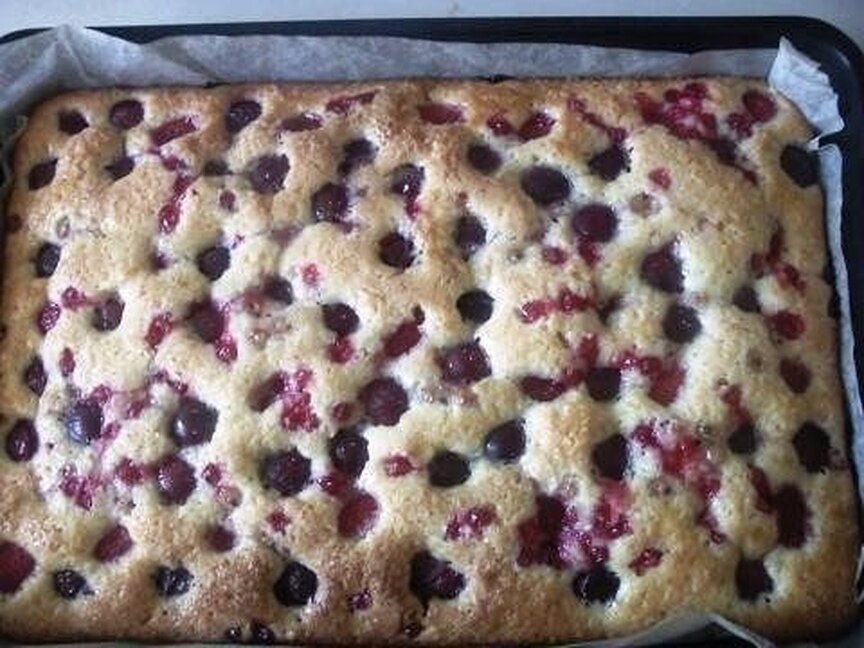 Теперь на тесто выкладываем ягоды, немного их притапливая. У меня вишня, малина и белая, красная смородина⠀