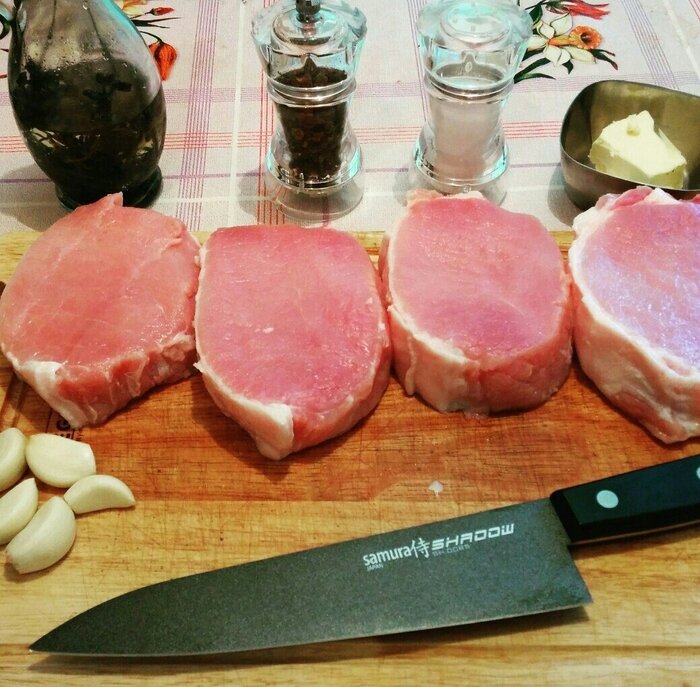 Нужные ингредиенты Способ приготовления Свинину достать из холодильника и нагреть до комнатной температуры, затем промыть, обсушить и порезать на средние стейки. Затем сбрызнуть лимонным соком, натереть солью и перцем со всех сторон. Чеснок разделить на зубчики и почистить. В сковороду с толстым дном налить масло. Поставить сковородку на огонь и разогреть. После чего выкладывает в разогретое масло веточки тимьяна и зубчики чеснока. Обжаривать эти ингредиенты до появления запаха. Вынуть из масла тимьян и зубчики чеснока. Заложить мясные стейки на сковороду и обжаривать на среднем огне приблизительно 1 минуту. Теперь перевернуть и полить сверху соком с жиром, который образовался. Продолжать процесс жарки ещё 1 минуту. Затем снова перевернуть мясо и жарить ещё 1 минуту. Такие процессы проделывать ещё 2-3 раза. Готовое жареное мясо подавать горячим с любым овощным гарниром. Приятного Аппетита! Подписывайтесь на КАНАЛ и ставьте лайк!
