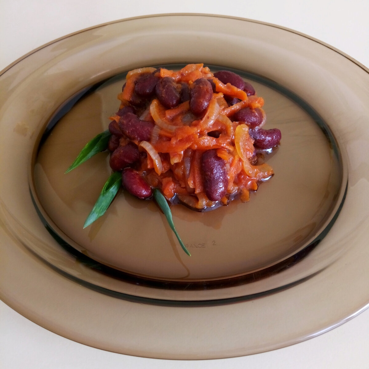 Лук с морковкой обжарить на масле, добавить томатную пасту. Потушить, помешивая 5-7 минут, посолить, добавить фасоль, специи. Помешивать 5-7 минут, добавить чуть воды, если получается густо.