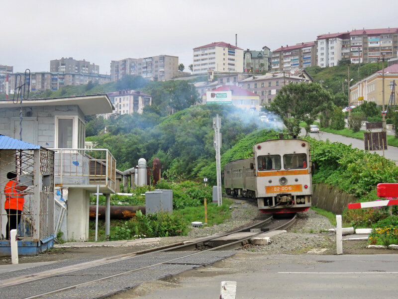 Оттуда же, из Людинова - маневровые ТГМ7 (1974-83) и ТГМ11 (1992-94). Внешне они почти одинаковые, но последние оказались хуже и в итоге увидеть их можно лишь в Холмске. А это - станция Взморье на охотском берегу, и по ту сторону её вокзала - рынок крабов: