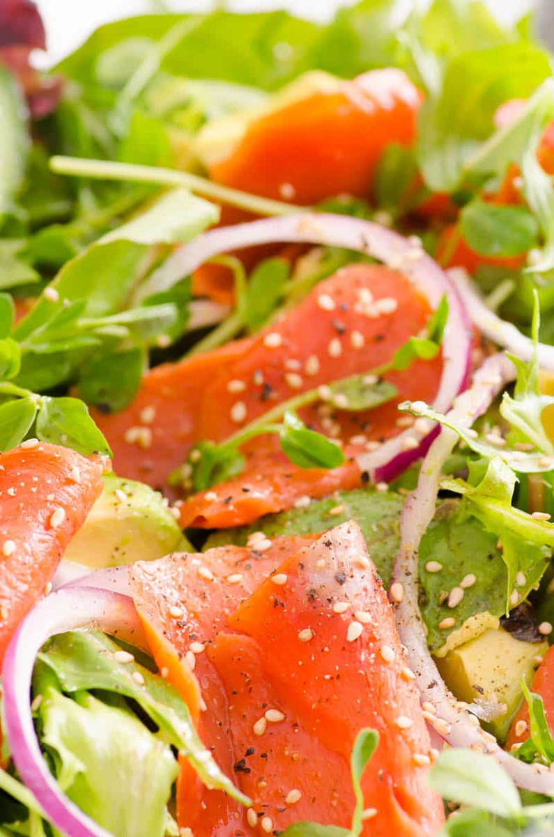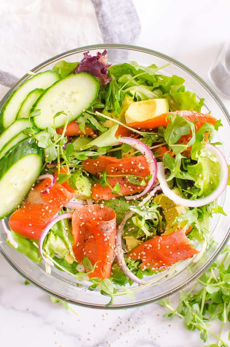 Этот салат из лосося с авокадо легкий, выглядит впечатляюще и все же является одним из самых легких , который я когда-либо готовила. Салат с большим количестком зелени, противовоспалительным яблочным уксусом и полезным для сердца авокадо. Ингредиенты: Приготовление 2. Затем добавьте авокадо порезанный небольшими кусочками, огурец , порежьте кольцами и добавьте для свежести и красный лук порежьте кольцами. 3. Сверху посыпать кунжутом и перцем, сбрызнуть уксусом и оливковым маслом. Слегка перемешайте! Все готово! Спасибо за внимание! Ставьте нравится, если нравится! Подписывайтесь на канал!