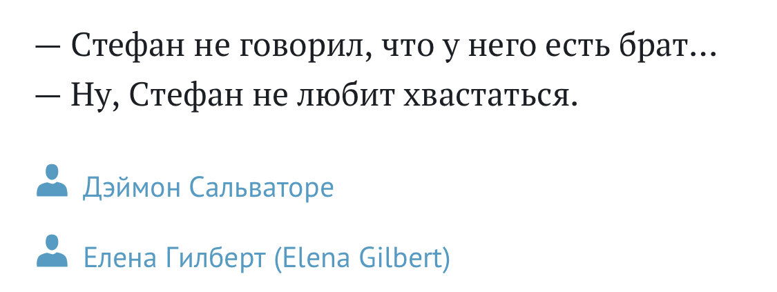 Сегодня мне хотелось бы вспомнить в виде цитат несколько прикольных моментов с участием Деймона Сальваторе. Не могу представить себе сериал без его саркастичных шуточек. Кто не смотрел «Дневники вампира», возможно, не поймёт в чём прикол. Но если вам нравится такой юмор — то это одна из причин посмотреть этот сериал. Итак, поехали! Деймон: — Тебе налить? Стефан: — Нет, спасибо, я не голоден. Только что поел. Деймон: — А тебя не беспокоит, что однажды все лесные звери соберутся и отомстят. Нуу, они же общаются. Привет, дневник! Сегодня бурундук спросил как меня зовут. Я сказал, что меня зовут Джо. Теперь эта ложь будет преследовать меня до конца жизни. Вампиры не размножаются, но мы любим пытаться. Елена: — Кэтрин уже была в этом доме, значит её пригласили. Так что теперь делать? Деймон: — Переехать! Елена: — Очень полезный совет, спасибо! Я что, попал в параллельный мир, где со Стефаном весело? Стефан: — Анна забрала Елену! Деймон: — Да, я понял это, прослушав 600 сообщений на автоот