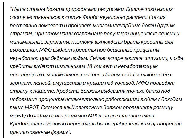 Ни для кого не секрет, что финансовое положение большей части населения сейчас находится не в лучшем состоянии, в связи с чем сегодня процветают всяческие микрофинансовые и кредитные организации, которые выдают населению займы под большие проценты. Вернуть долги у простого человека не всегда получается. Учитывая, что многие граждане берут не один кредит/займ, а также учитывая проценты, пени и иные платежи, долг растет как снежный ком и должник сам не понимает, как ему из него выбраться. На сайте Российской общественной инициативы была размещена инициатива № 77Ф55334, авторы которой предлагают списать пенсионерам и малоимущим гражданам все проценты по их долгам, оставив только сумму основного долга, а также: ☑️ Запретить все микрофинансовые организации; ☑️ Выдавать кредиты населению только в банках и под минимальные проценты; ☑️ Запретить кредитование безработным и лицам, чей доход ниже МРОТ. Автор инициативы в описании указывает: Стоит отметить, что это не первая подобная инициатива,